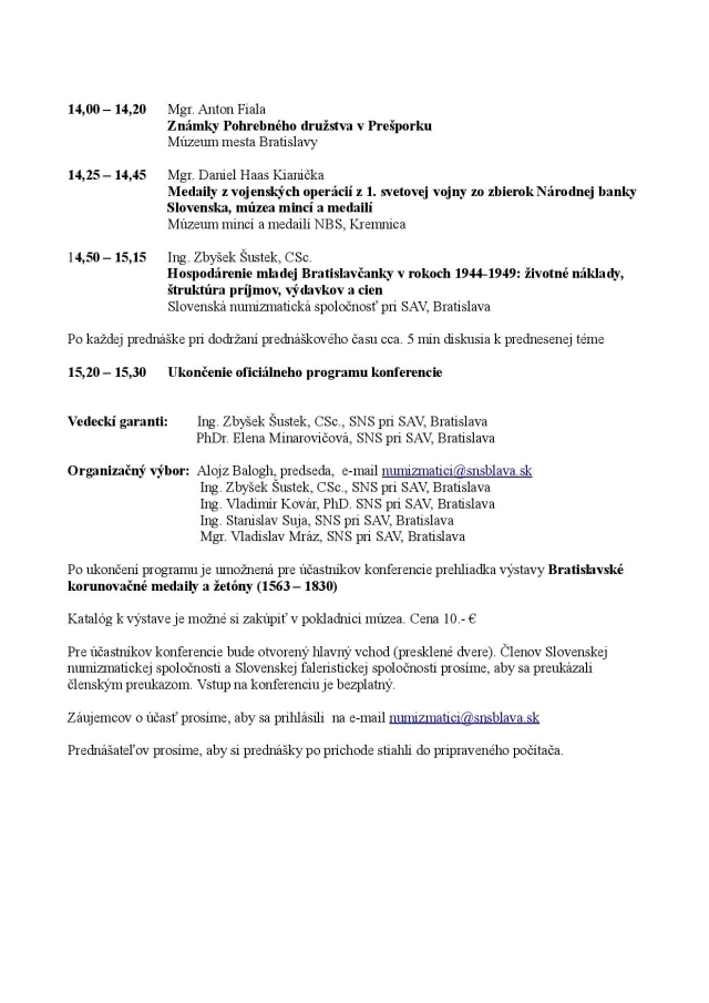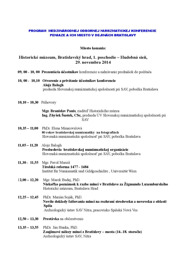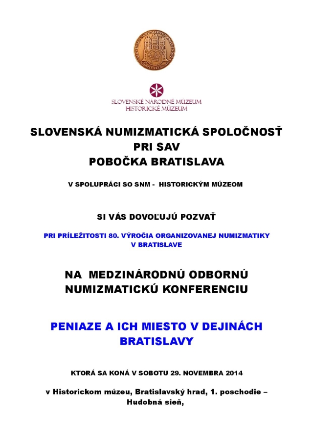 Pozvánka na medzinárodnú odbornú numizmatickú konferenciu PENIAZE A ICH MIESTO V DEJINÁCH BRATISLAVY